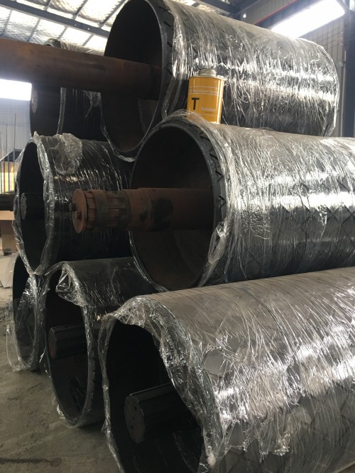 鄭煤集團第二批替換下來的滾筒發到我廠進行檢修,跟上次一樣要求表面進行菱形膠板包膠,厚度不低于12mm,截至目前已經全部完工,準備發往客戶現場!